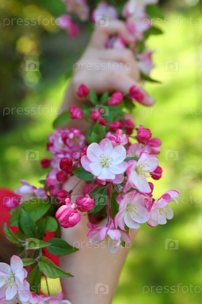 Руки держат ветку с цветущими райскими яблоками в парке