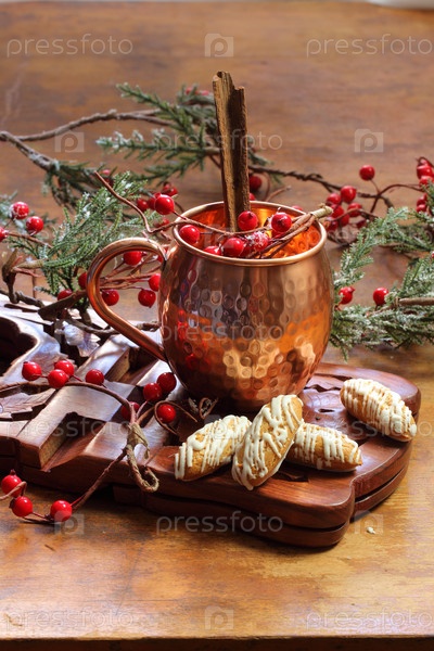 Глинтвейн с клюквой, апельсином и корицей на деревянном столе