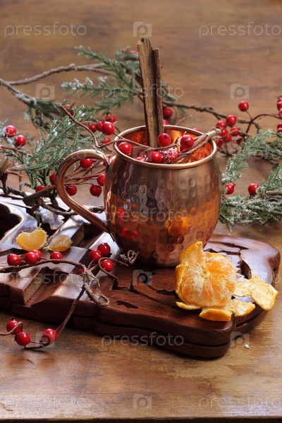 Глинтвейн с клюквой, апельсином и корицей на деревянном столе