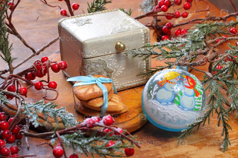 Натюрморт с имбирным рождественским печеньем и еловыми ветками