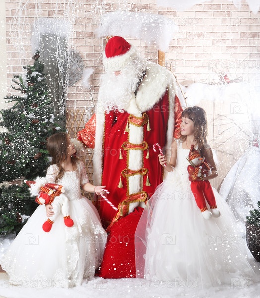 Маленькие девочки общаются с Дедом Морозом в новогодних декорациях