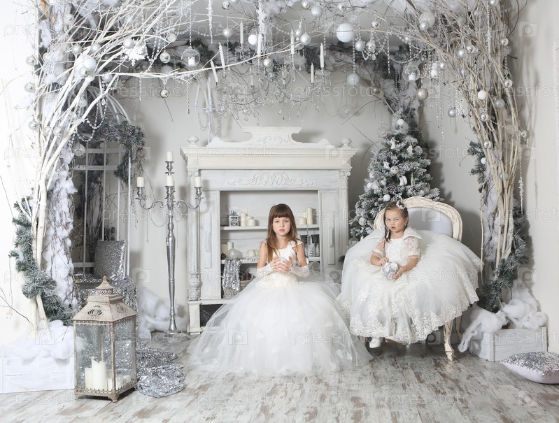 Две красивые девочки в белых платьях в новогоднем интерьере