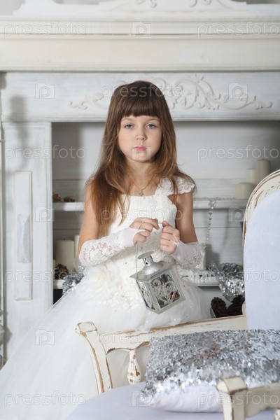 Маленькая красивая девочка в белом платье в новогоднем интерьере