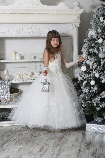 Маленькая красивая девочка в белом платье в новогоднем интерьере