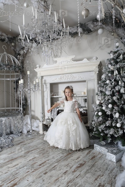 Маленькая красивая девочка в белом платье в новогоднем интерьере