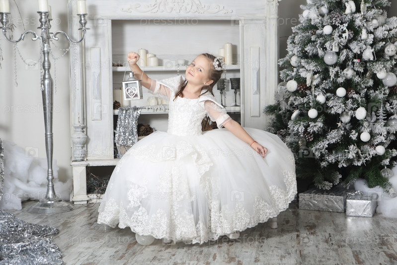 Маленькая красивая девочка в белом платье в новогоднем интерьере