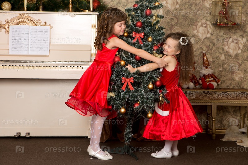 Две девушки в красных платьях украшают елку