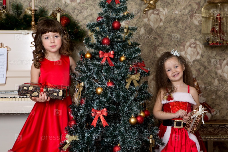 Две девушки в красных платьях украшают елку