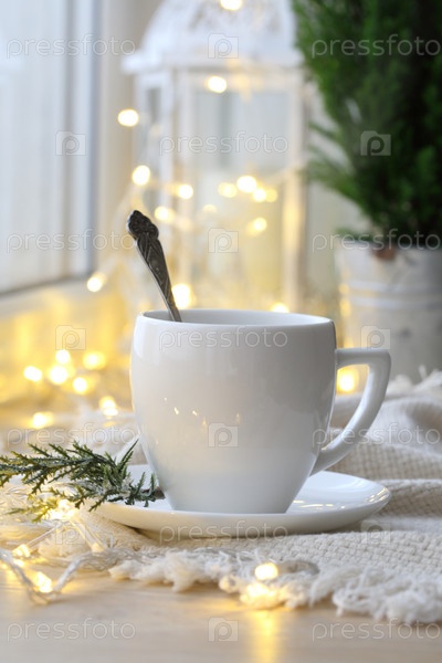 Кофейная чашка на фоне рождественской гирлянды