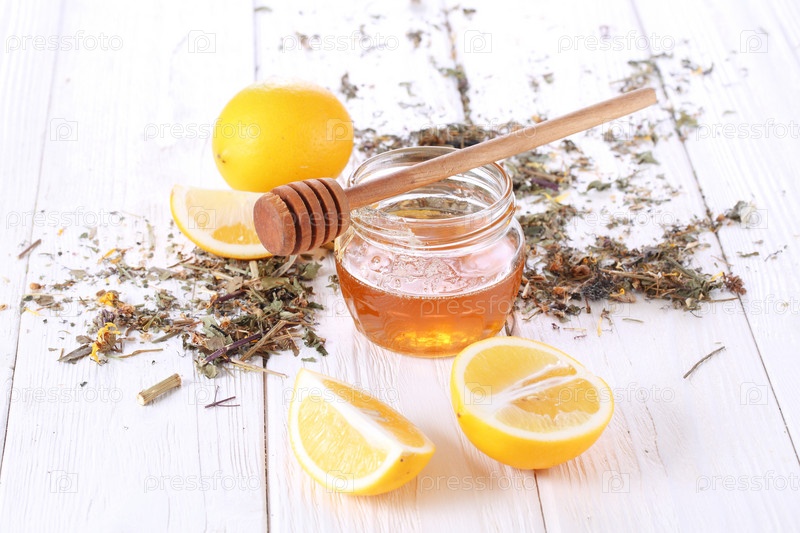 Натюрморт с лимоном,имбирем и медом на белом фоне
