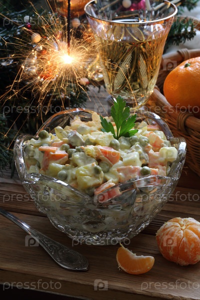 Традиционный русский рождественский салат Оливье с шампанским и мандаринами