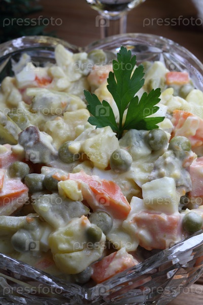 Традиционный русский рождественский салат Оливье с шампанским и мандаринами