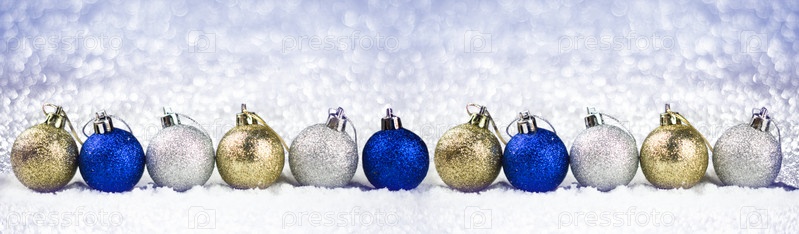 Ряд елочных шаров в снегу на фоне сверкает. Новогоднее настроение