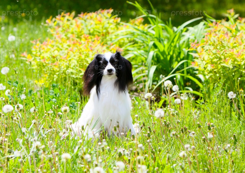 Собака породы фален позирует летом на улице. Милый щенок сидит в зеленой траве и цветах. Красивая собака с висячими ушами