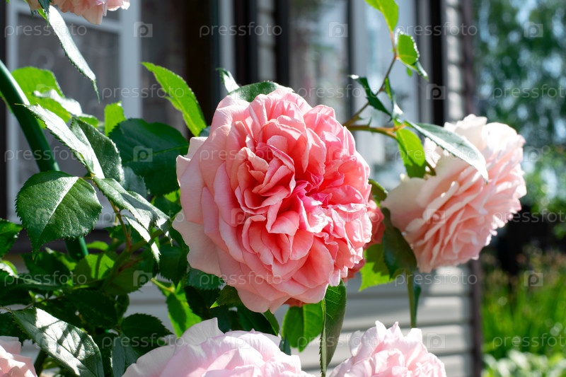 Красивая розовая плетистая роза цветет у коттеджа в саду в солнечный день