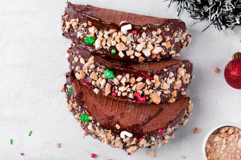 Сладкие тако с шоколадными вафлями и мороженым с рождественской посыпкой и орехами на белом столе. Праздничная десертная вариация мексиканской классики