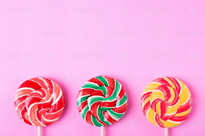 Три леденца на розовом фоне. Плоская укладка. Копировать пространство