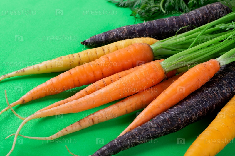 Оранжевая, желтая и фиолетовая морковь на зеленом. Органический овощ