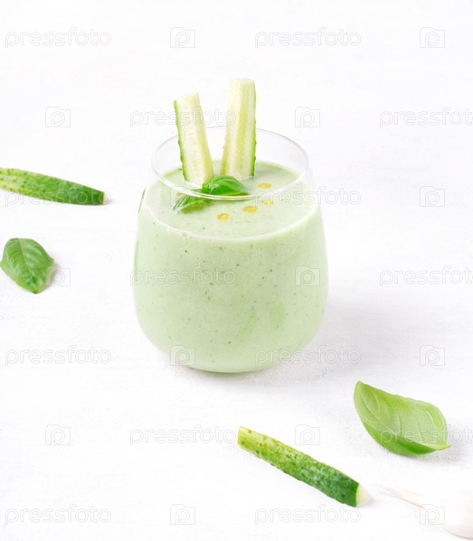 Зеленый гаспачо со свежим огурцом, йогуртом, зеленью, чесноком и оливковым маслом подается в стакане. Испанский холодный суп