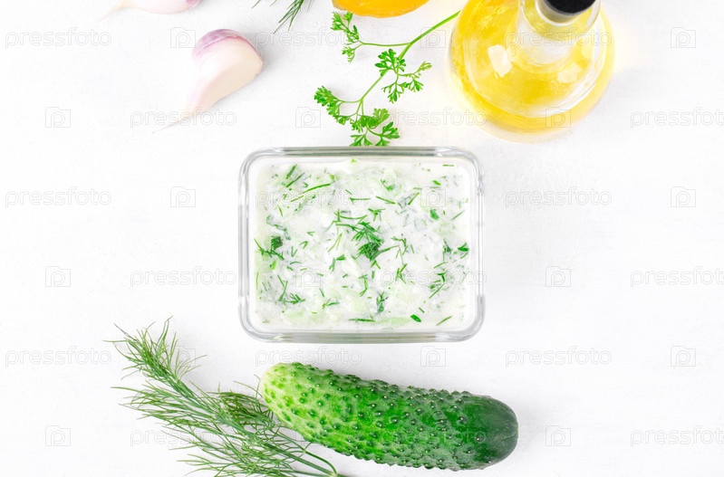 Цацики, огуречный соус с йогуртом, чесноком, оливковым маслом, травами и лимонным соком на белом столе. Греческий соус