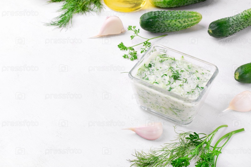 Цацики, огуречный соус с йогуртом, чесноком, оливковым маслом, травами и лимонным соком на белом столе. Греческий соус