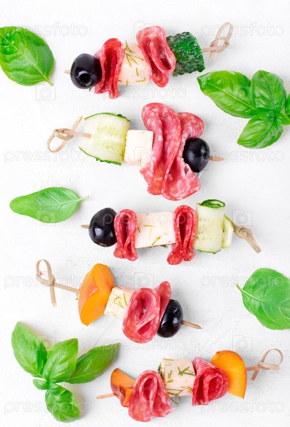 Мини-закуски на вертеле с салями, сыром фета, оливками, персиком и огурцом на белом столе. Плоская укладка. Еда для вечеринок