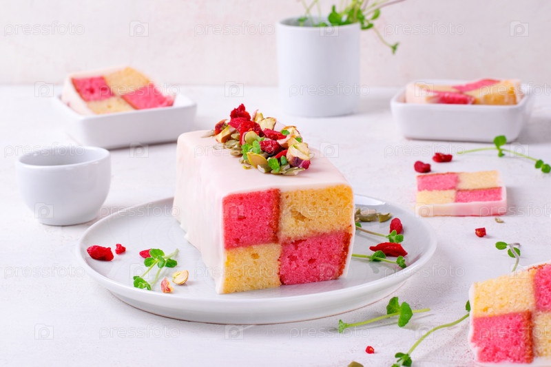 Торт Баттенберг, традиционный британский десерт с двухцветным бисквитом, завернутым в марципан, с орехами и ягодами на белом столе