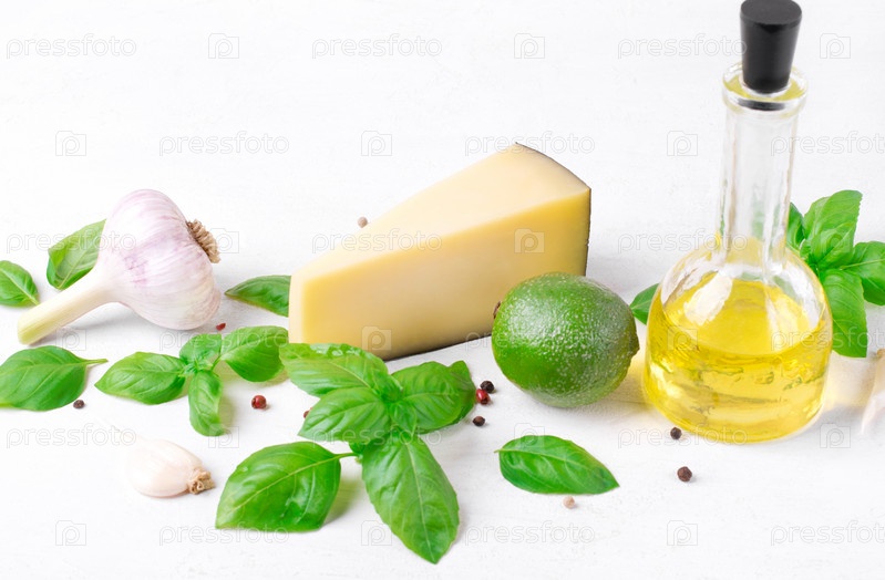 Ингредиенты для соуса песто на белом столе. Приготовление итальянского соуса с базиликом