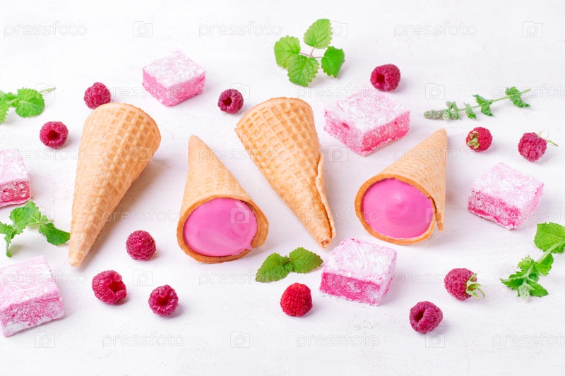Малиновый зефир в вафельных рожках и кубиках на белом столе. Изысканные вариации десерта