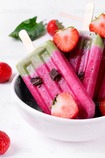 Двухслойное мороженое с ягодами, шпинатом и шоколадной стружкой подается на деревянном столе