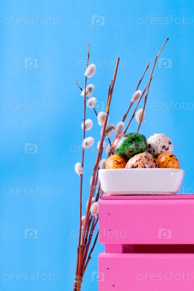 Конфетные пасхальные яйца и веточка вербы на розовом деревянном ящике на синем фоне