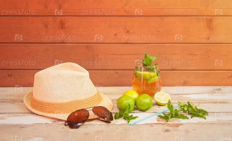 Шляпа, солнцезащитные очки и стакан коктейля мохито с лаймом и мятой на деревянном столе