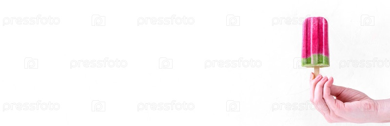 Двухцветное эскимо в руке женщины на белом фоне. Веб-баннер с копией пространства. Летний десерт