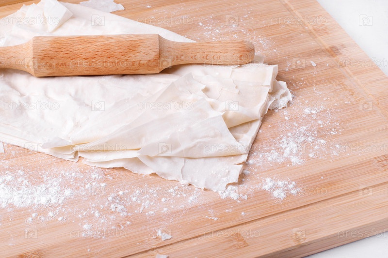 Тесто фило и скалка на деревянной доске