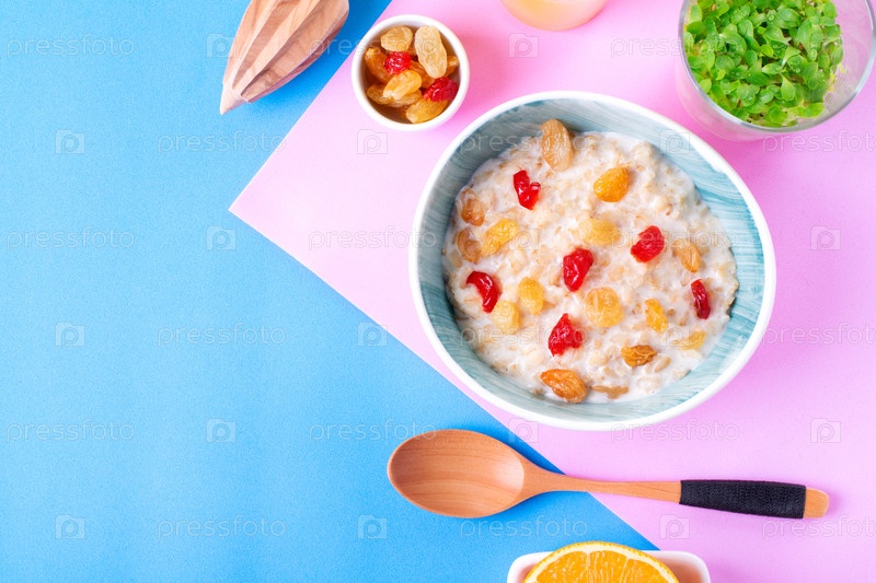 Каша с молоком, сушеной вишней и изюмом в керамической миске на красочном фоне. Еда на завтрак. Вид сверху