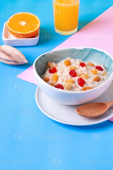 Каша с молоком, сушеной вишней и изюмом в керамической миске и свежим апельсиновым соком на красочном фоне. Завтрак