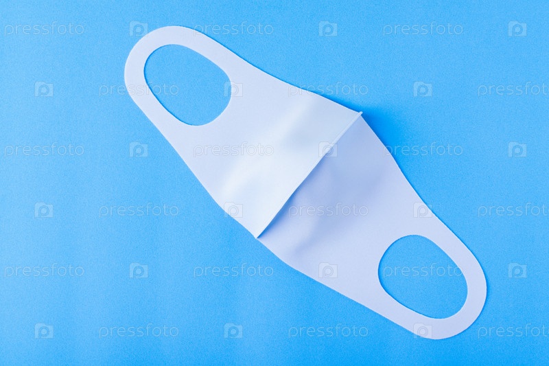 Синяя маска для лица из мягкой ткани на цветном фоне. Защитная маска из многоразового моющегося материала