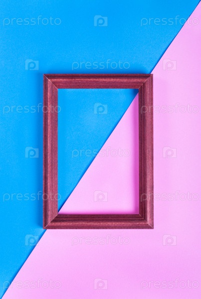 Деревянная фоторамка на диагональном геометрическом розовом и синем фоне. Шаблон с копией пространства