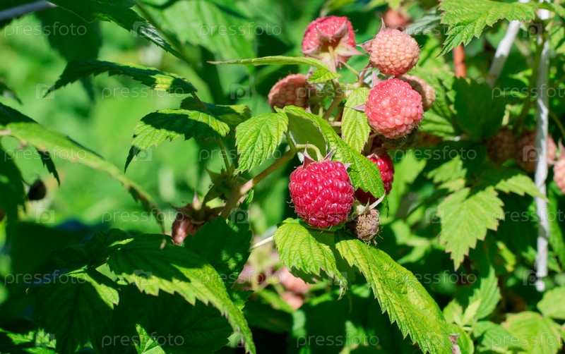 Малина созревает на кусте под лучами солнца. Домашние ягоды