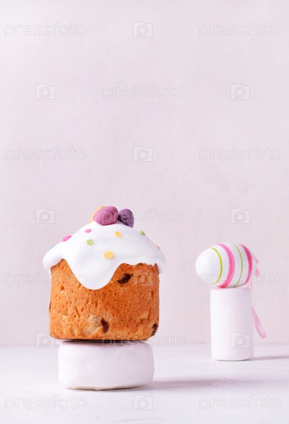 Пасхальный кулич с зефирной глазурью и шоколадными яйцами и декоративным пасхальным яйцом на белых подиумах. Креативная праздничная композиция