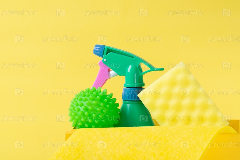 Набор для чистки на желтый. Зеленая бутылка с распылителем, шарик для стирки, губка и тряпка. Инструменты для уборки