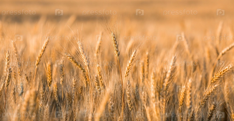 Золотые колосья пшеницы на фоне созревающего поля. Сельскохозяйственное растение крупным планом