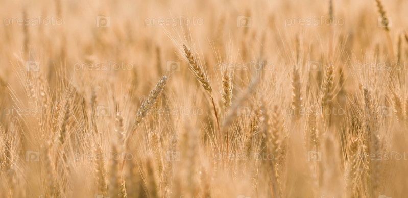 Золотые колосья пшеницы на фоне созревающего поля. Сельскохозяйственное растение крупным планом