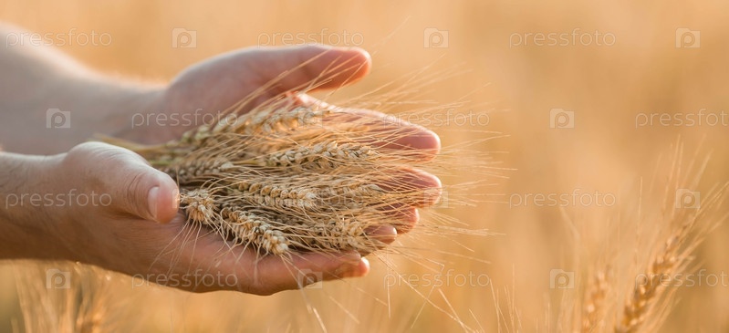 Мужчина держит золотые колосья пшеницы на фоне созревающего поля. Руки фермера крупным планом. Концепция посадки и сбора богатого урожая. Сельский пейзаж на закате