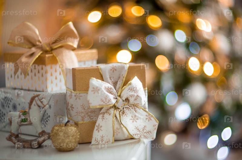 Красивые подарочные коробки на столе рядом с елкой в комнате. Красивое боке на заднем плане. Место для текста. Концепция новогодних праздников