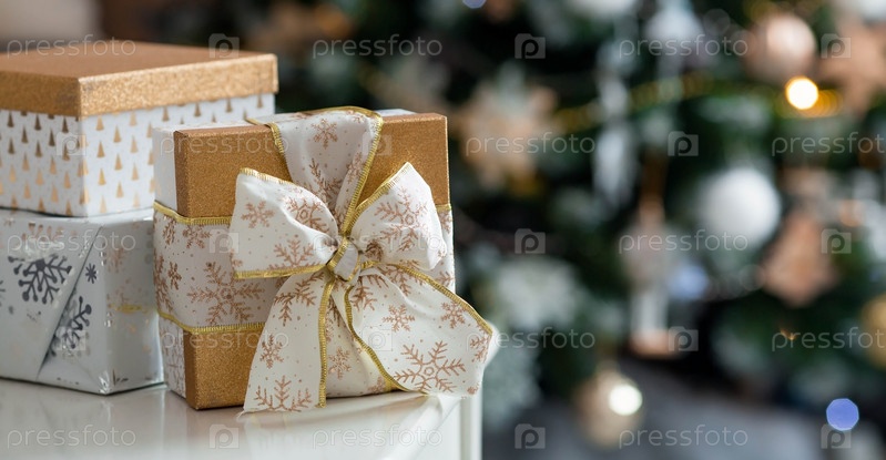 Красивые подарочные коробки на столе рядом с елкой в комнате. Красивое боке на заднем плане. Место для текста. Концепция новогодних праздников
