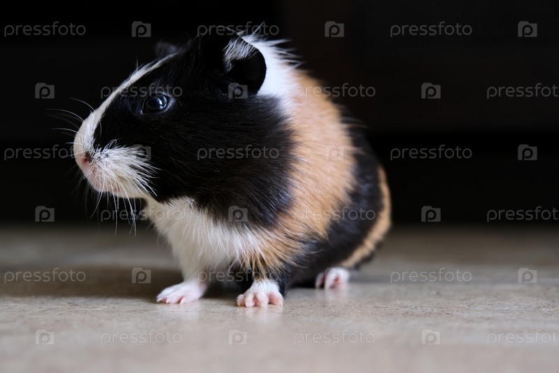 Трехцветная морская свинка стоит на полу на темном фоне. Домашнее животное
