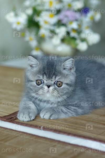 Красивый серый котенок экзотической короткошерстной породы лежит на коричневом фоне дома на фоне букета ромашек. Размытый фокус
