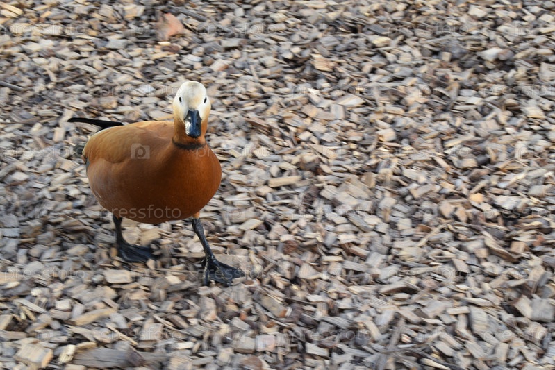 Утка стоит на покрытии из древесной стружки возле озера