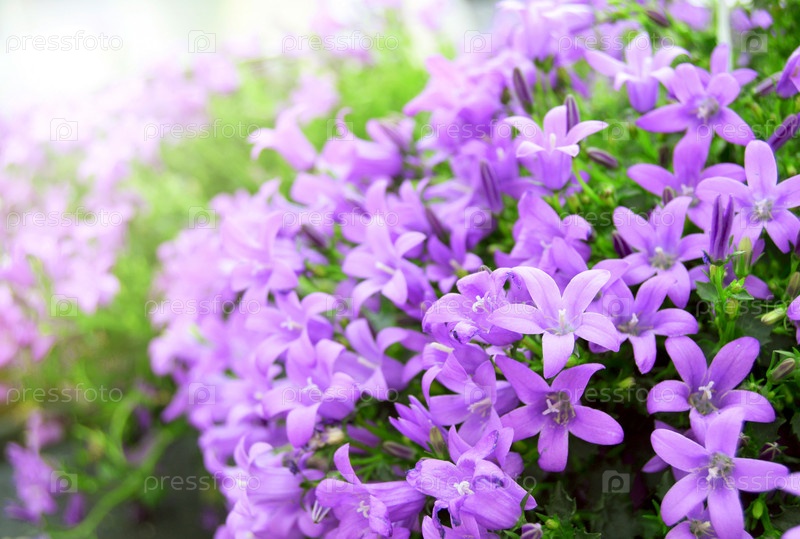 Клумба с цветами колокольчика в солнечный день, фон
